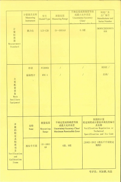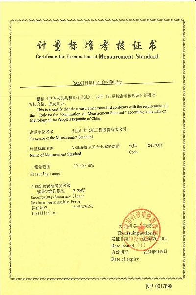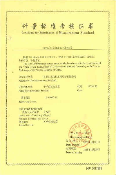 公司已取得壓力表計量、液壓千斤頂?shù)挠嬃繕?biāo)準(zhǔn)考核證書, 目前正在申請CNAS認(rèn)可, 計劃增加扭矩扳手、吊具檢測等多項計量能力。